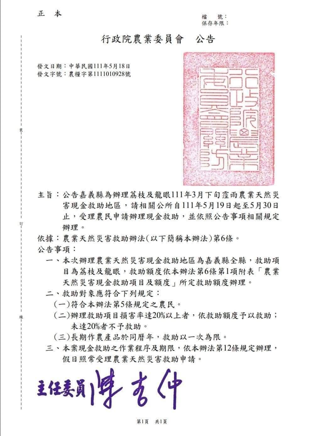 行政院農業委員會業於111年5月18日公告本縣為辦理荔枝及龍眼111年3月下旬霪雨農業天然災害現金救