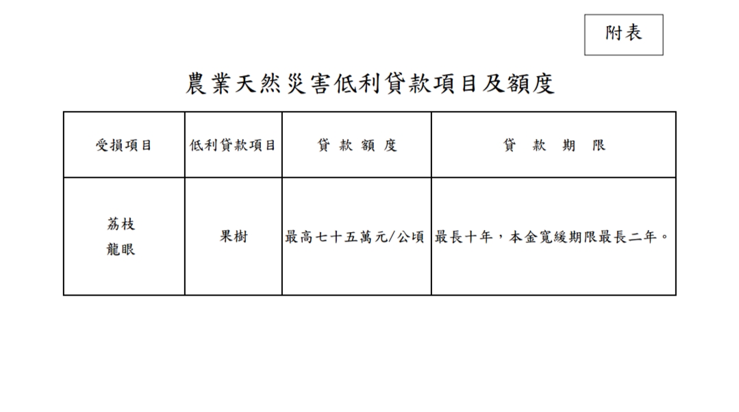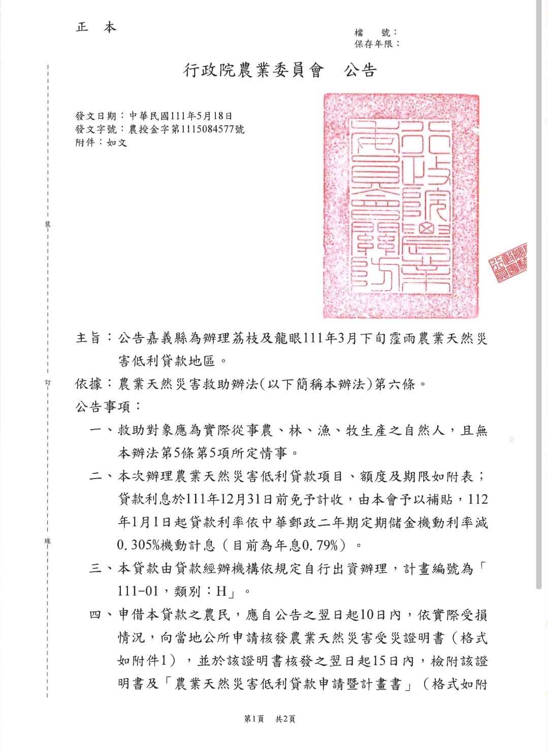行政院農業委員會業於111年5月18日公告嘉義縣為辦理荔枝及龍眼111年3月下旬霪雨農業天然災害低利