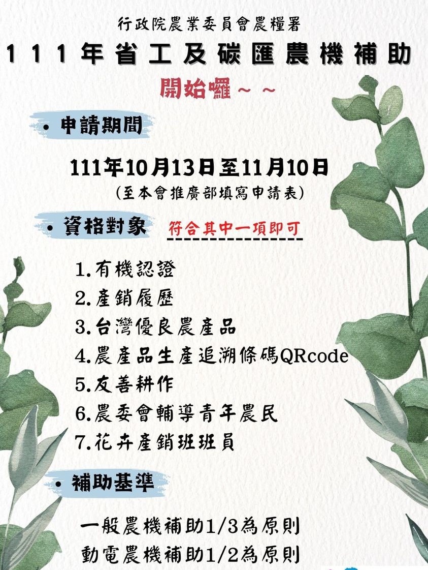 本會辦理111年省工及碳匯農機補助實施計畫,自即日起開始受理申請。