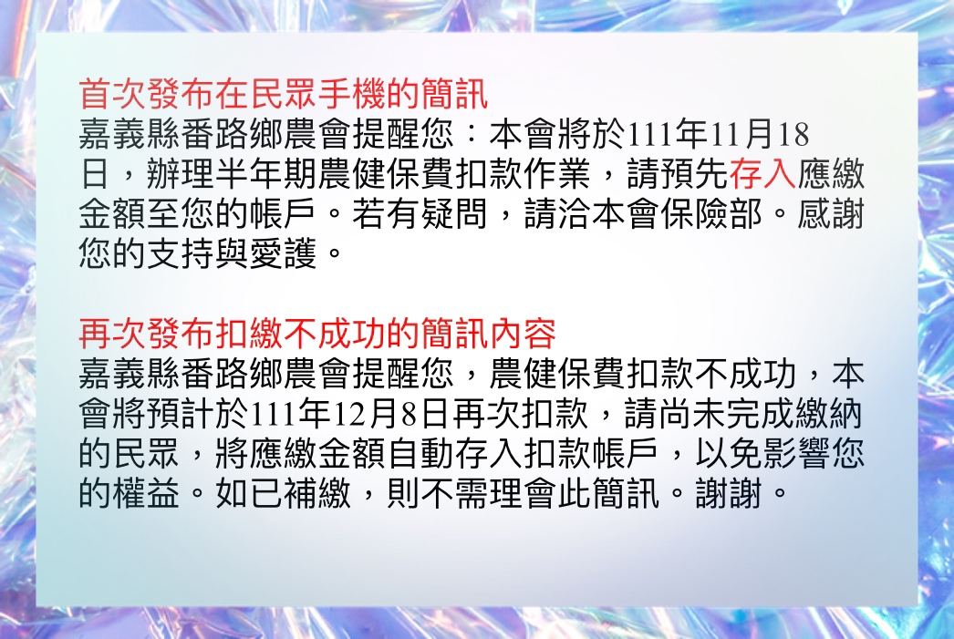 ◎農健保費扣款不成功,本會將預計於111年12月8日再次扣款。也會發送扣繳不成功的簡訊通知。