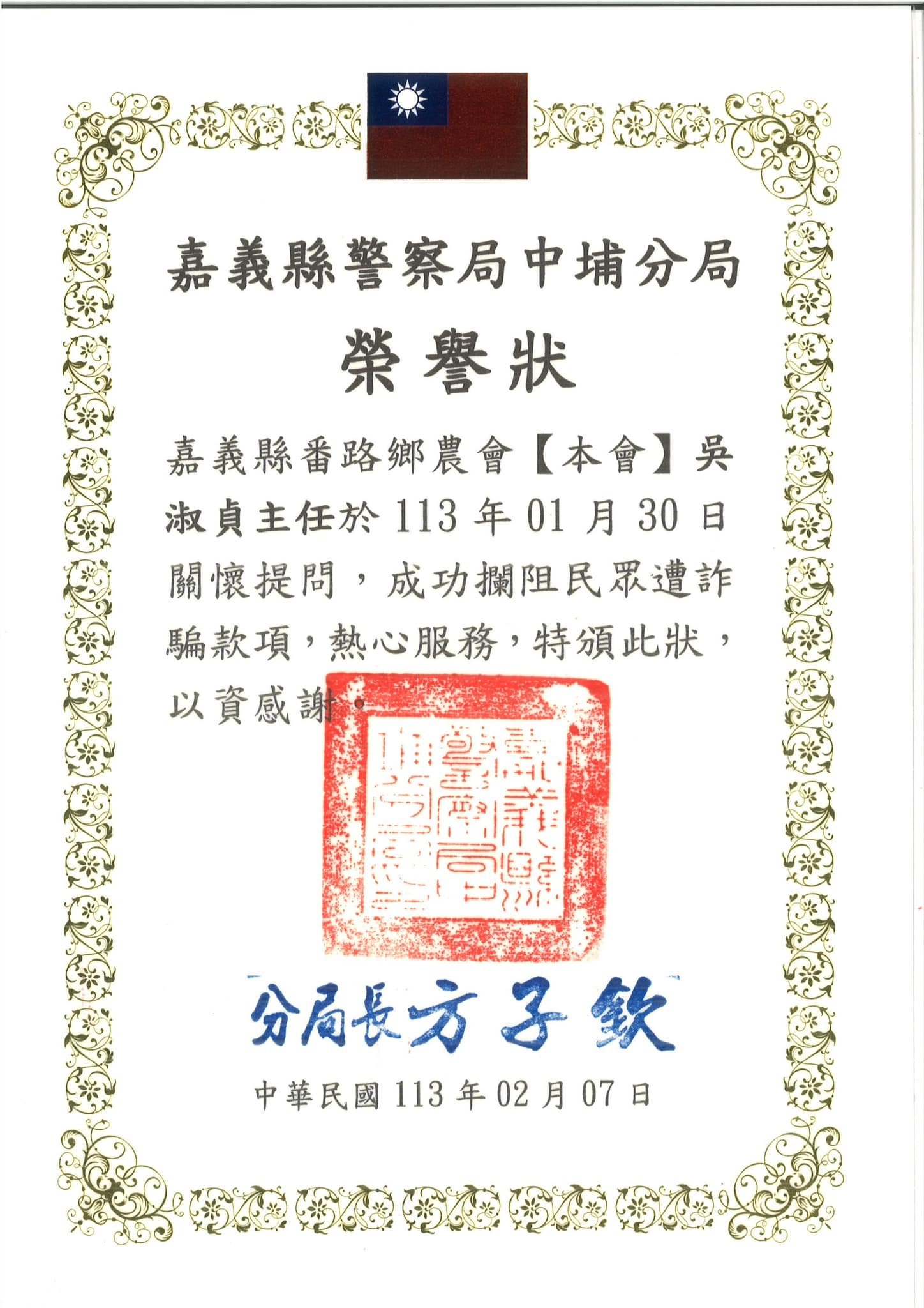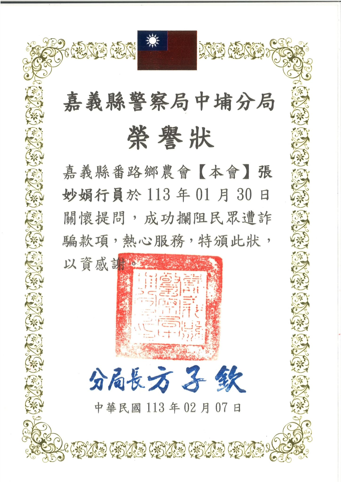 以感謝農會員工以高度警覺心順利阻攔詐騙