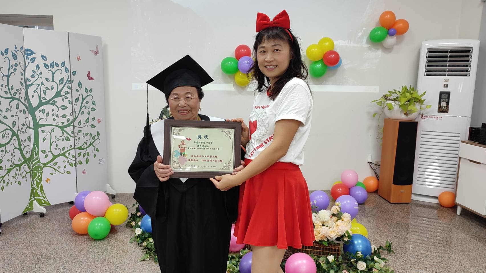 頒發四年「學習優良獎狀」還拍下了美美的紀念照