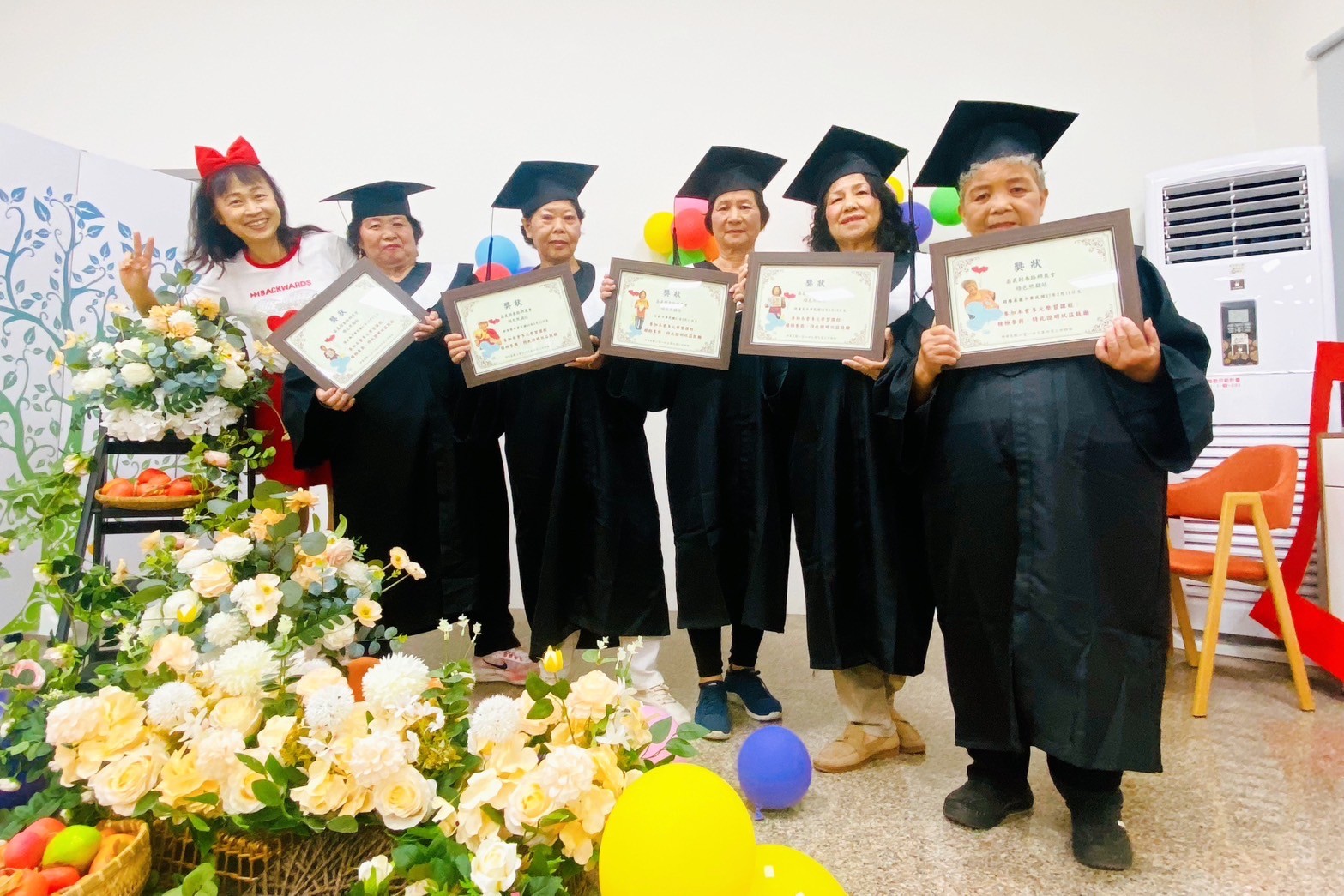 今天總幹事幫團員畫上美麗彩妝,一起在精心佈置的綠色照顧場域合照,為他們留下了珍貴的回憶,看著學員們上拿到績優獎狀時笑容滿面,柿編也感受到他們的喜悅與滿足。