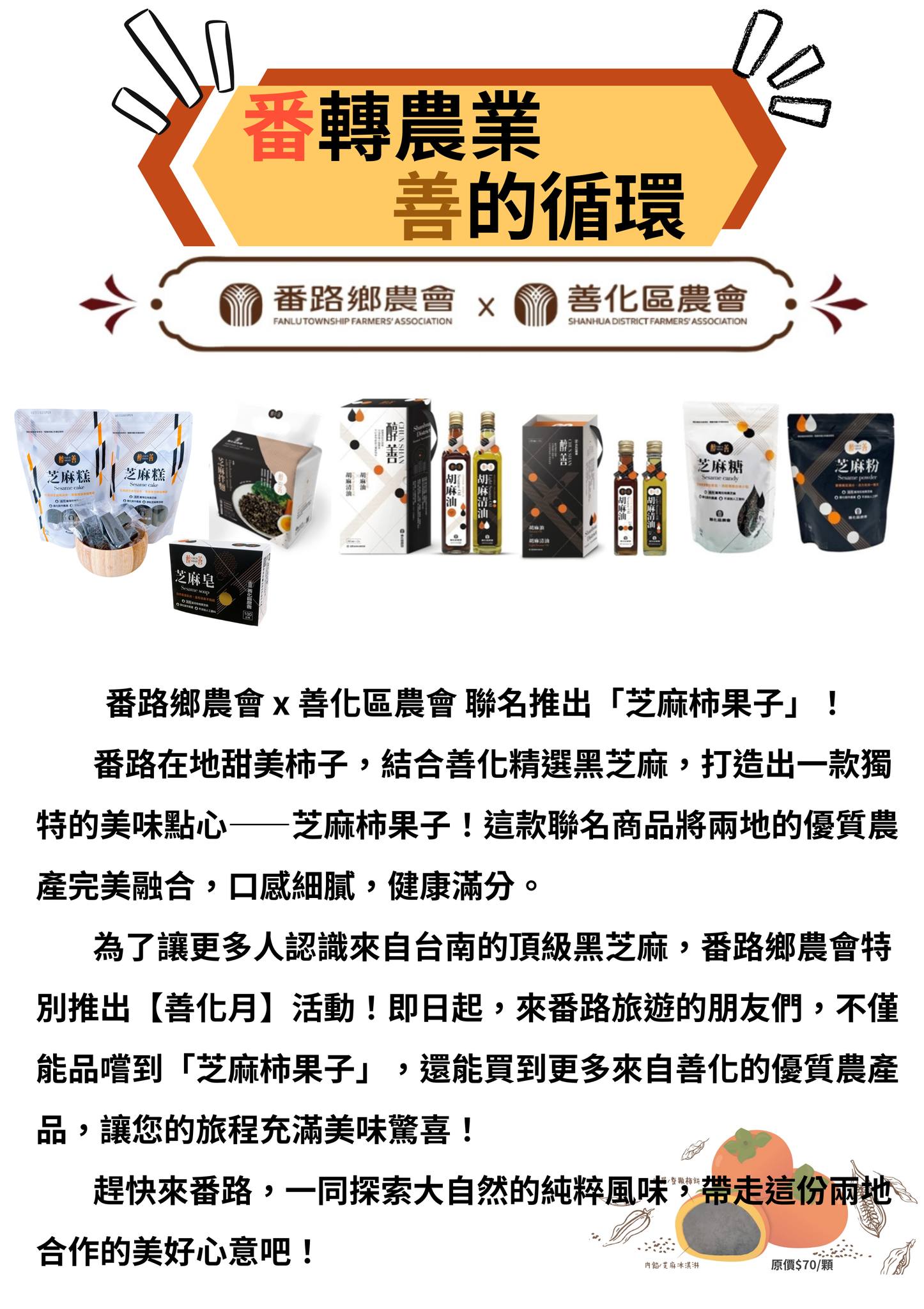 番路鄉農會這個月特別推出「善化月」,只要到 番路鄉農會-飲冰柿茶集 就能購買善化區農會的最優質農產品。柿粉們,這可是千載難逢的優惠活動!