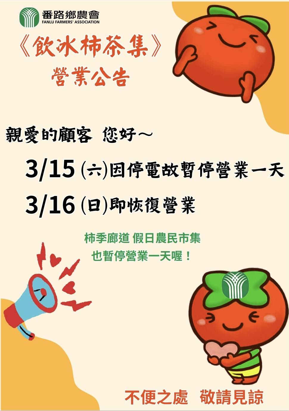 番路鄉農會《飲冰柿茶集賣場》3/15(六)因停電故暫停營業一天,3/16(日)即恢復營業,柿季廊道 假日農民市集,也暫停營業一天喔!不便之處 敬請見諒!!