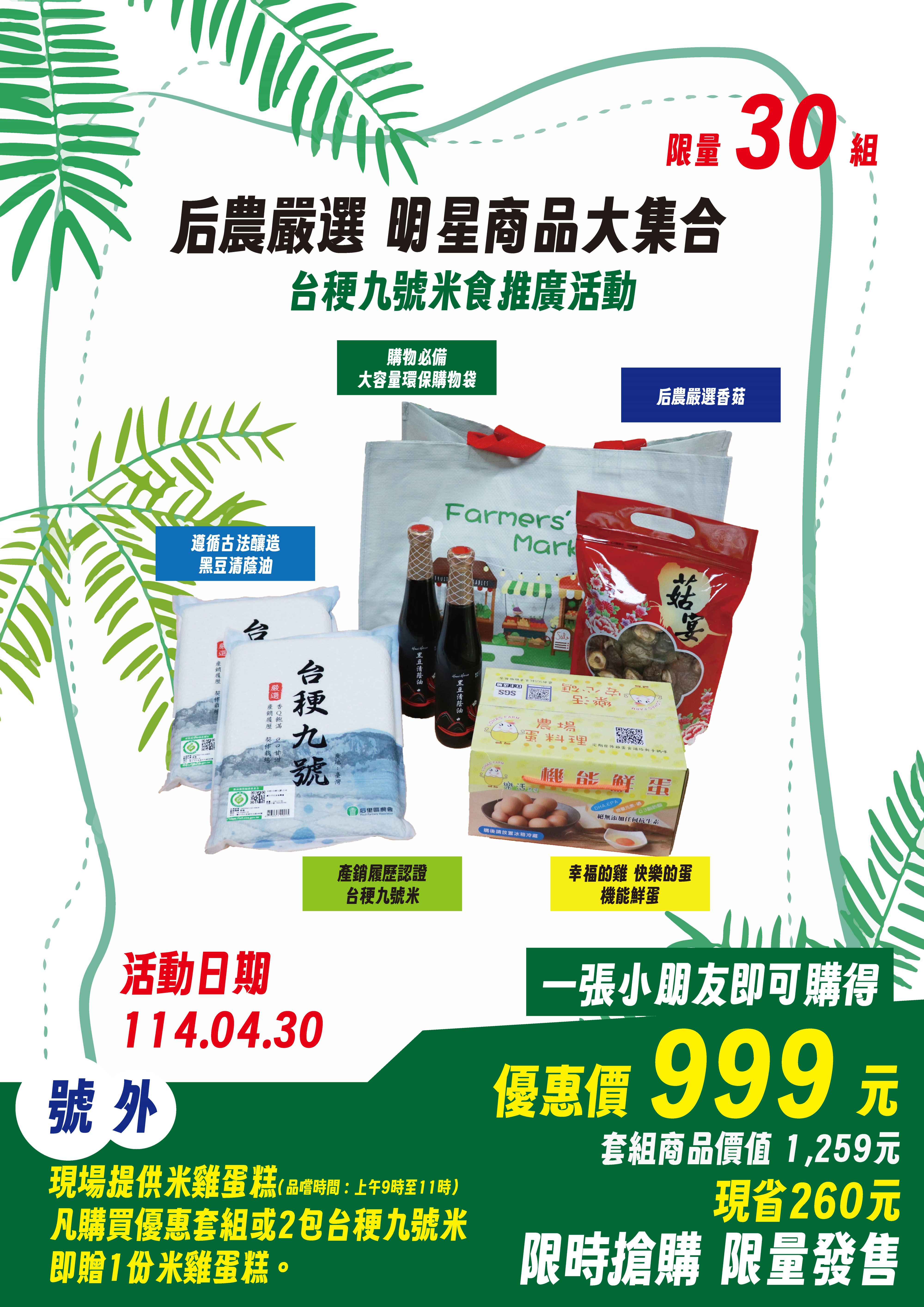 四、凡購買優惠套組或2包九號米,即贈1份米雞蛋糕;米雞蛋糕品嘗時間:上午9時至11時。