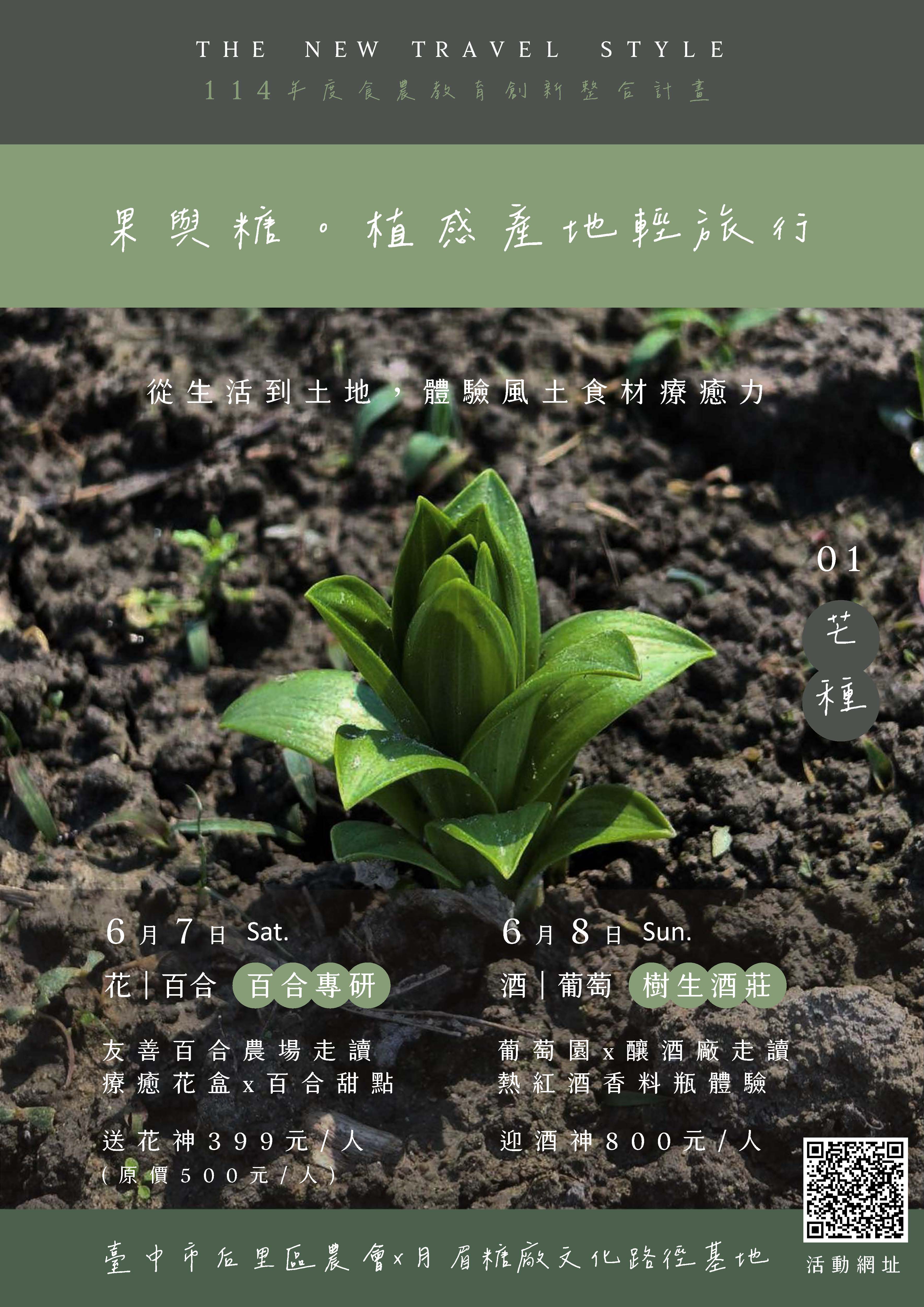◆活動內容:友善百合農場走讀、療癒花盒X百合甜點;葡萄園X釀酒廠走讀、熱紅酒香料瓶體驗