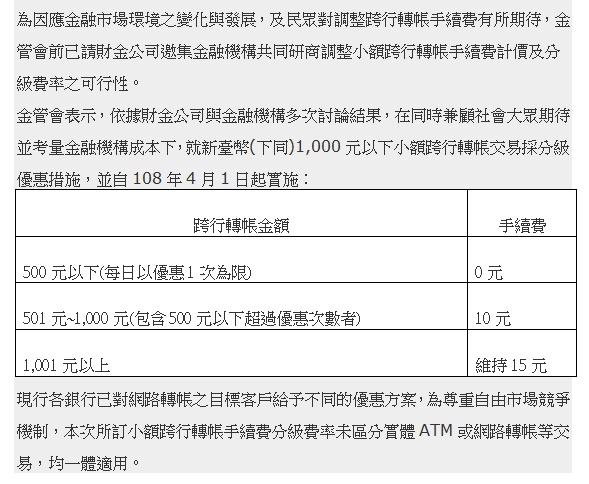 金管會表示,依據財金公司與金融機構多次討論結果,在同時兼顧社會大眾期待並考量金融機構成本下,就新臺幣(下同)1,000元以下小額跨行轉帳交易採分級優惠措施,並自108年4月1日起實施: