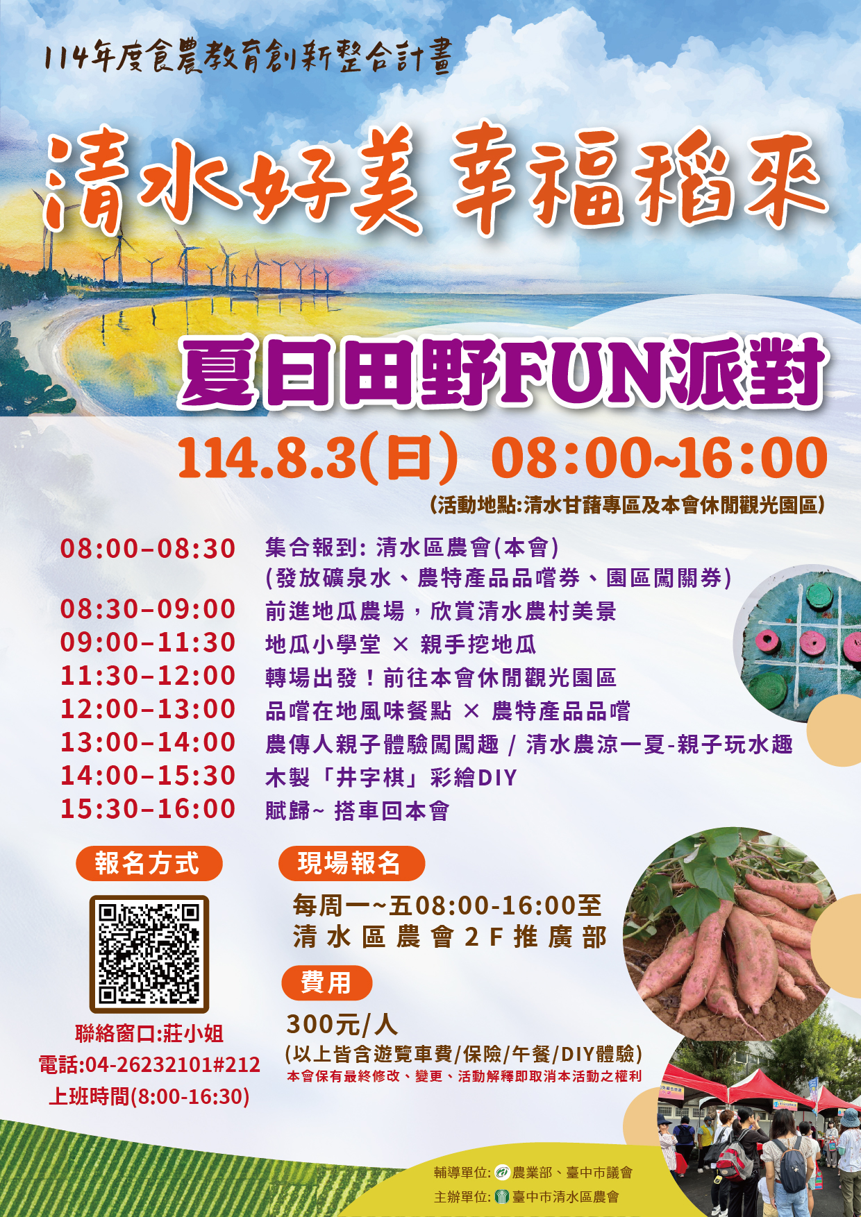 ◆活動內容:前進地瓜農場、地瓜小學堂、清水休閒觀光園區、親子體驗闖關趣、木製井字棋彩繪DIY