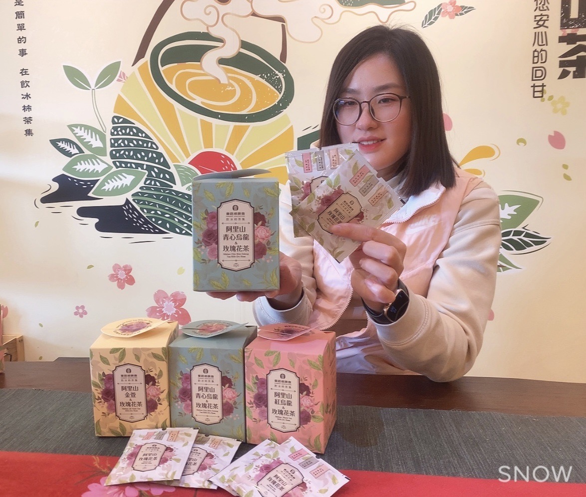 更與在地栽植之花農異業合作,將番路鄉阿里山100%手採產銷履歷驗証茶葉(青心烏龍、金萱)與番路鄉阿里山下生產之食用玫瑰花,融入年輕人喜愛的元素(花、安全、時尚),開發三款方便即時沖泡飲用的阿里山花茶,提供消費者簡約便捷的沖泡方式和輕鬆自在的喝茶體驗。
