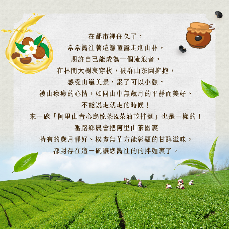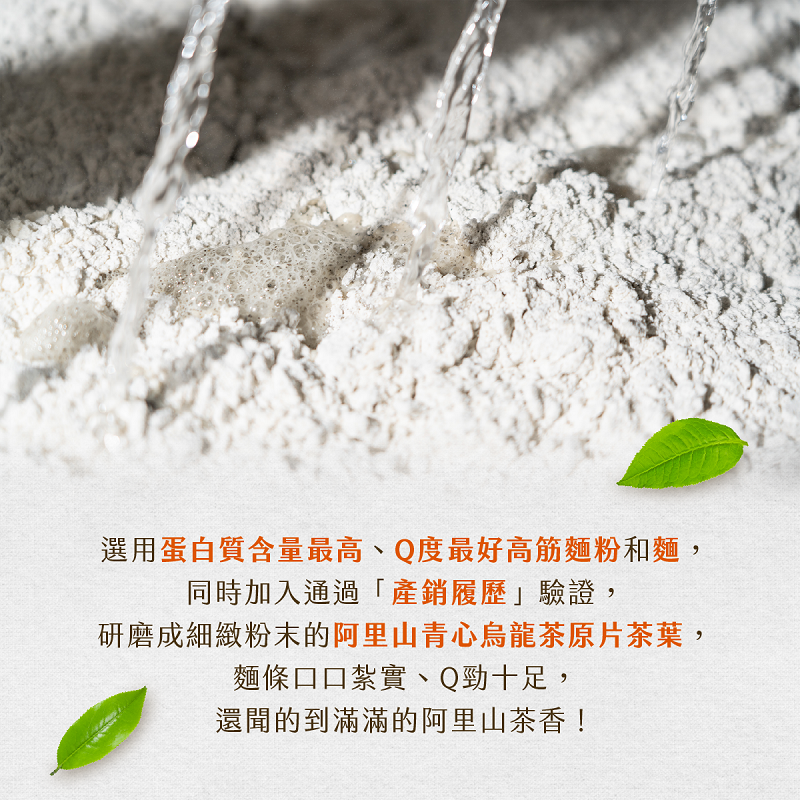採用有「產銷履歷」驗証的原片茶葉~研磨為細緻粉末揉進麵裏以為「麵之靈魂」,手工傳承製麵技法,結合南台灣微炙豔陽,讓麵條q彈帶勁、爽口解油膩,堪稱為麵中極品