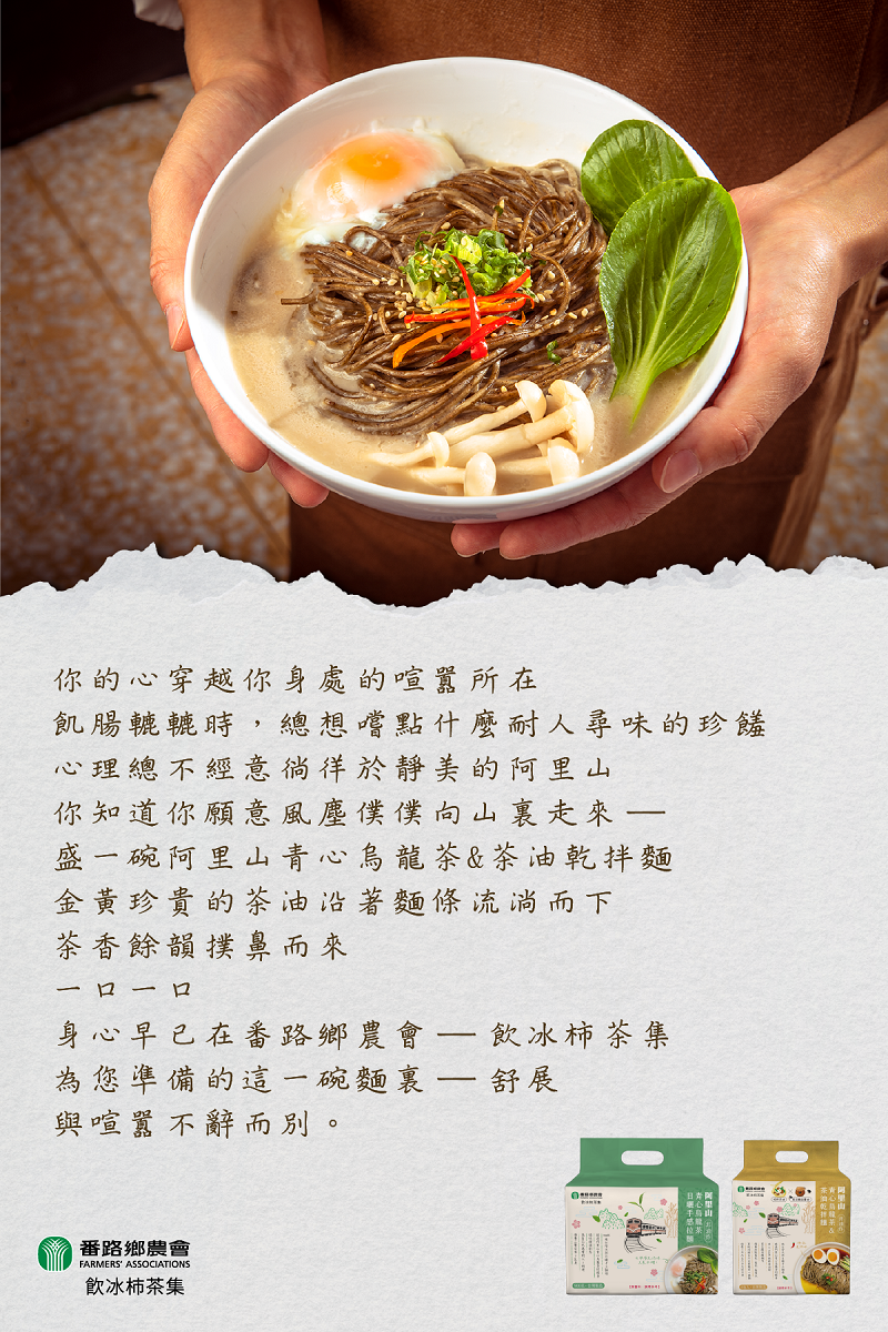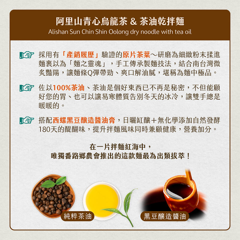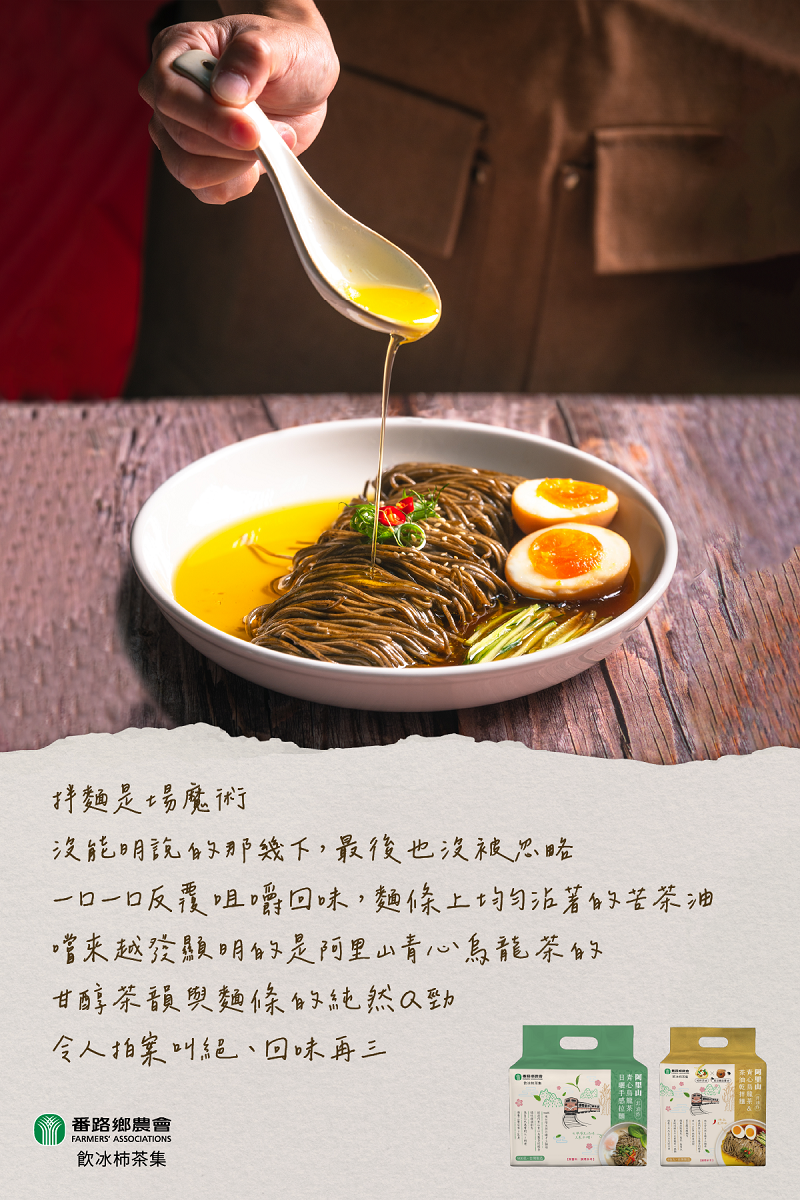 搭配西螺黑豆釀造醬油膏,?日曬缸釀+無化學添加自然發酵180天的醍醐味,提升拌麵風味同時兼顧健康,營養加分。在一片拌麵紅海中,唯獨番路鄉農會推出的這款麵最為出類拔萃!
